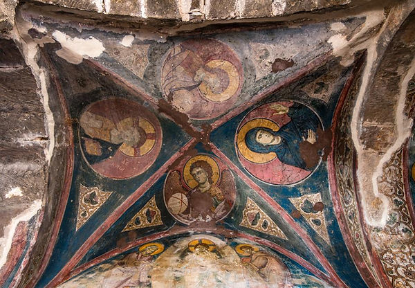 The interior has some of its original masonry templon and frescoes. The frescoes are mostly from the late 13th/early 14th century and although not in good condition show some lively scenes which include the Entry into Jerusalem and the Annunciation to Anna, with the Koimisis on the western wall. There is a depiction of the Pantokrator in the dome, while in the parekklision there is a fresco of the Mission of the Apostles and the Last Supper.