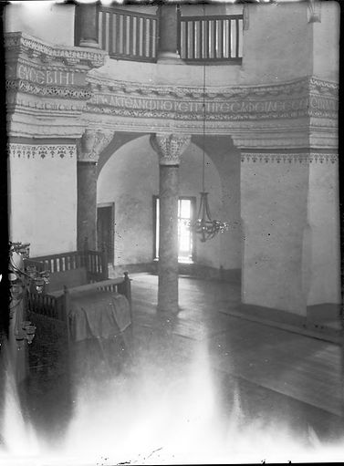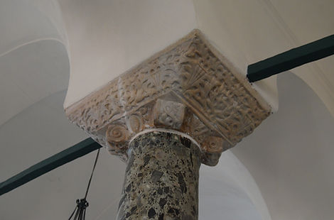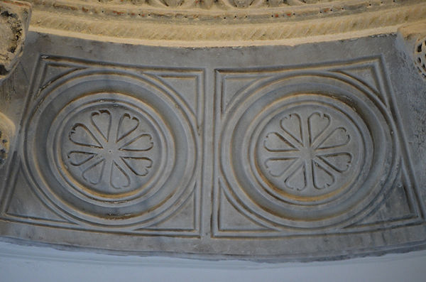 The dome, sanctuary, and vaults of Sts. Sergius and Bacchus were probably decorated with mosaics, perhaps similar to the original non-figurative mosaics of Hagia Sophia. The floors were originally covered with marble slabs, while the walls were covered with marble revetment similar to those found at Hagia Sophia and San Vitale. There are alternating pairs of greenish verd antique and red-veined Synnada marble columns between alternating exedras. The rest of the surviving interior marble decorations are made of gray-veined Proconessian marble. The columns at the ground level are crowned by the so-called “fold” or “melon” capitals, which support an inscribed horizontal entablature of 29 marble blocks at the level of the gallery floor. The gallery columns are crowned by Ionic impost capitals, which support triple arches. These 32 capitals were decorated with the monograms of Justinian and Theodora as well as the imperial title basileos. Its entablature was elaborately carved with an extensive imperial inscription and ornamental motifs, including egg-and-dart, tendril, and dentil decorations. The soffits of the architrave have rosette, square, and diamond designs. The lower cornices on the piers are decorated with split palmettes with pine cones or artichokes. There are egg-and-dart cornices above the gallery level. Masons’ marks can be found on several marble pieces, including reused slabs. Whatever remained of the Byzantine liturgical furniture was removed or reused when it was converted into a mosque. Two Late Antique marble panels, which were perhaps originally used as chancel screens for the templon, were used as the sides of the platform of the minbar. They are very similar in style to marble screens from San Vitale. Spolia can also be seen in the muezzin’s lodge and the Ottoman staircase to the gallery.
